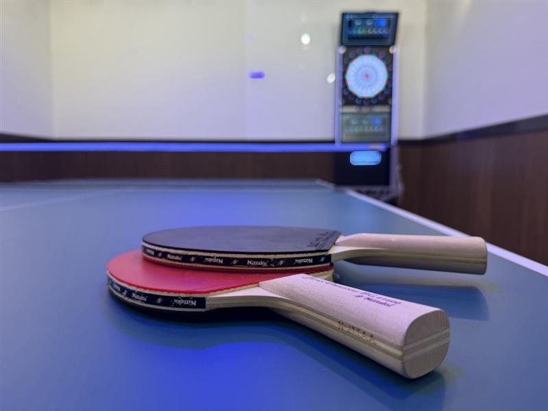 さらに、この卓球ルームにはダーツ設備も完備。卓球の合間にダーツで遊んだり、グループで交互に楽しむことができ、アクティビティの幅が広がります。照明はブラックライトに切り替え可能で、幻想的な空間の中でプレイすることで、まるで異世界にいるかのような非日常体験を味わえます。光る卓球ボールやラケットを使えば、視覚的にもインパクトのあるプレイが可能です。