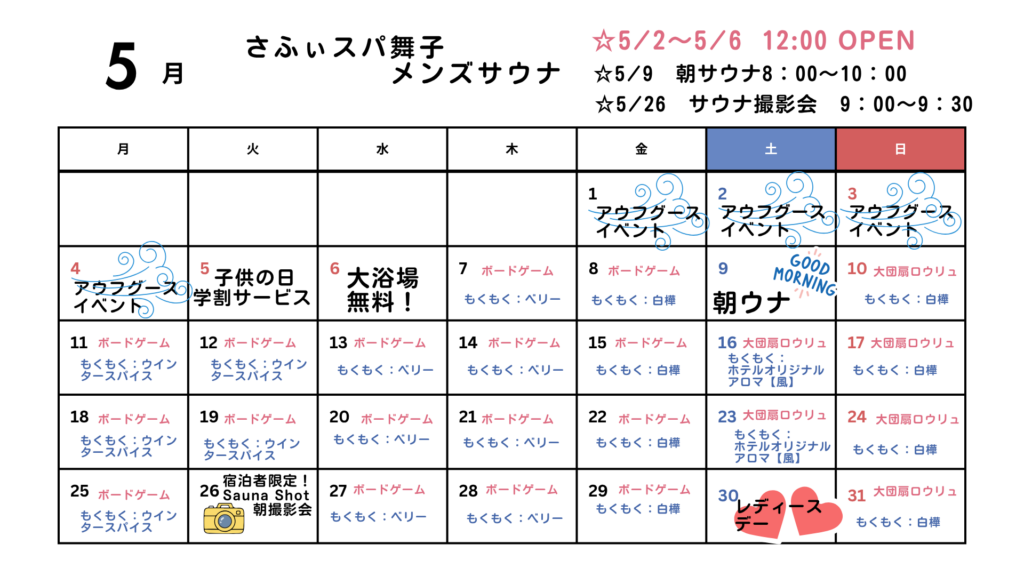 さふぃスパ舞子メンズサウナのスケジュールです。皆様ご来店お待ちしております!