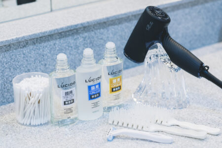 脱衣所:バスタオル、フェイスタオル、ReFa社製ヘアドライヤー、スケルトンブラシ、ヘアリキッド、ヘアトニック、アフターシェーブローション、綿棒